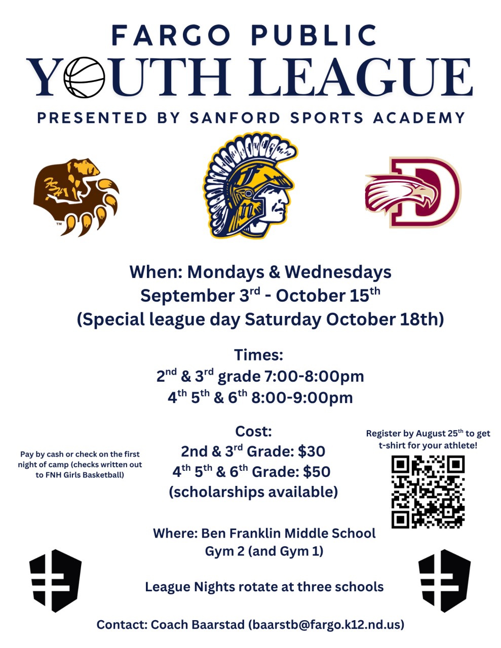 The fall camp is designed for skills, schemes, and competition for girls ranging from 2nd-6th grade. The head coaches of the Fargo Schools (us, Davies, and South) met with Freddy Coleman (head of Sanford Basketball) this summer trying to brainstorm ways to get girls more opportunities to participate in basketball throughout the year. This is the first year (so we are going to work out some kinks that come our way) so we are going to try this for only girls. Next year we are hoping to have an option for boys as well.